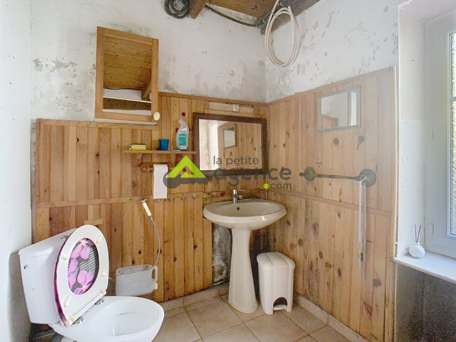 - Au rez-de-chaussée d’une grande pièce à vivre et son coin cuisine / repas avec cheminée, d’un poêle et d’une cuisinière à bois et d’une salle de bain avec wc :